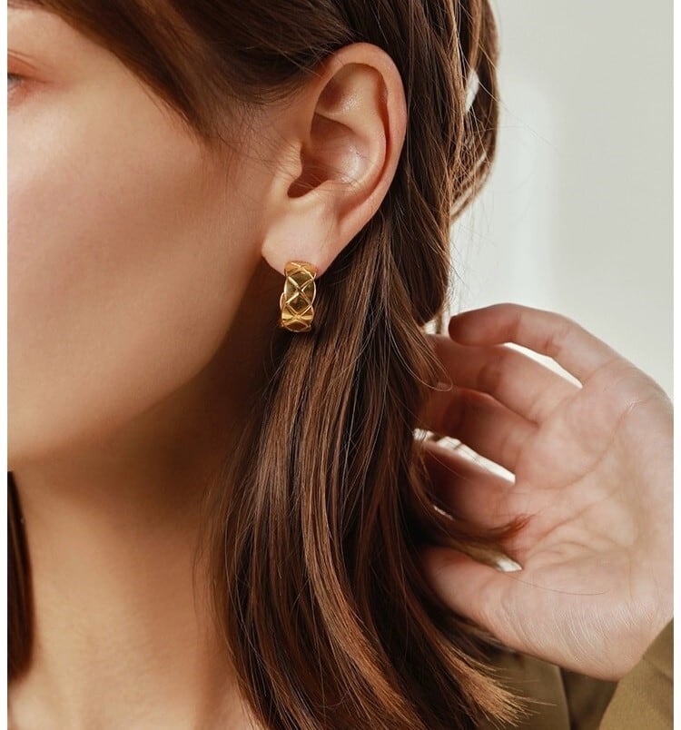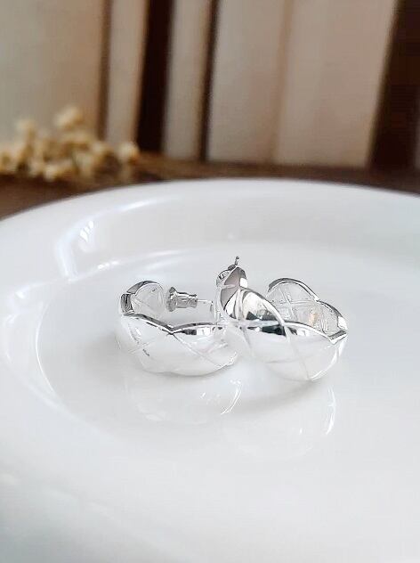上品な立体感と光沢が魅力のキルティングデザインのピアス。 洗練されたキルティングデザインが、シンプルながらも存在感のある耳元を演出します。 顔まわりに華やぎを添えたい日や、きれいめコーデのアクセントにもぴったり。 SV925刻印ポストで、肌に優しく安心してご使用いただけます。 サイズ:直径 約2.1cm カラー:シルバー 素材:銅、ゴールドメッキ ピアスポスト:SV925刻印ポスト